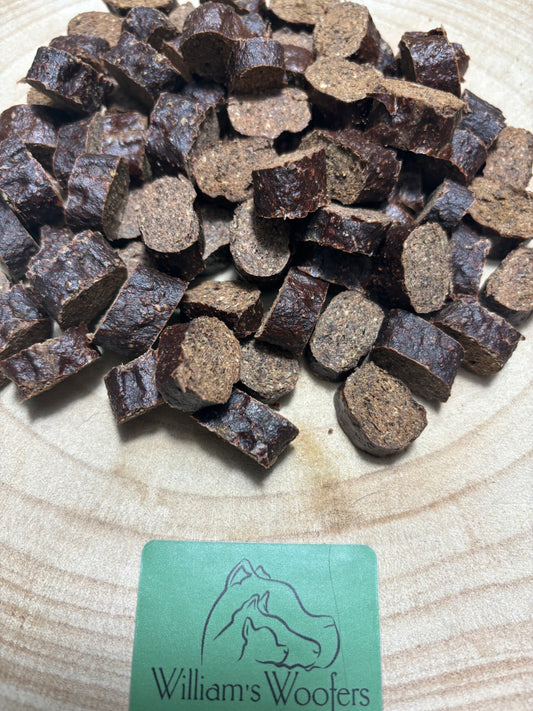 Our selection of gourmet bite-sized training treats and gourmet sausages are perfect for rewarding your pup during training sessions, walks, or just because! With a variety of delicious flavours and wholesome ingredients, these treats are tailored to fit tiny or big mouths without compromising on taste or nutrition. Whether your dog loves chicken, beef, venison..