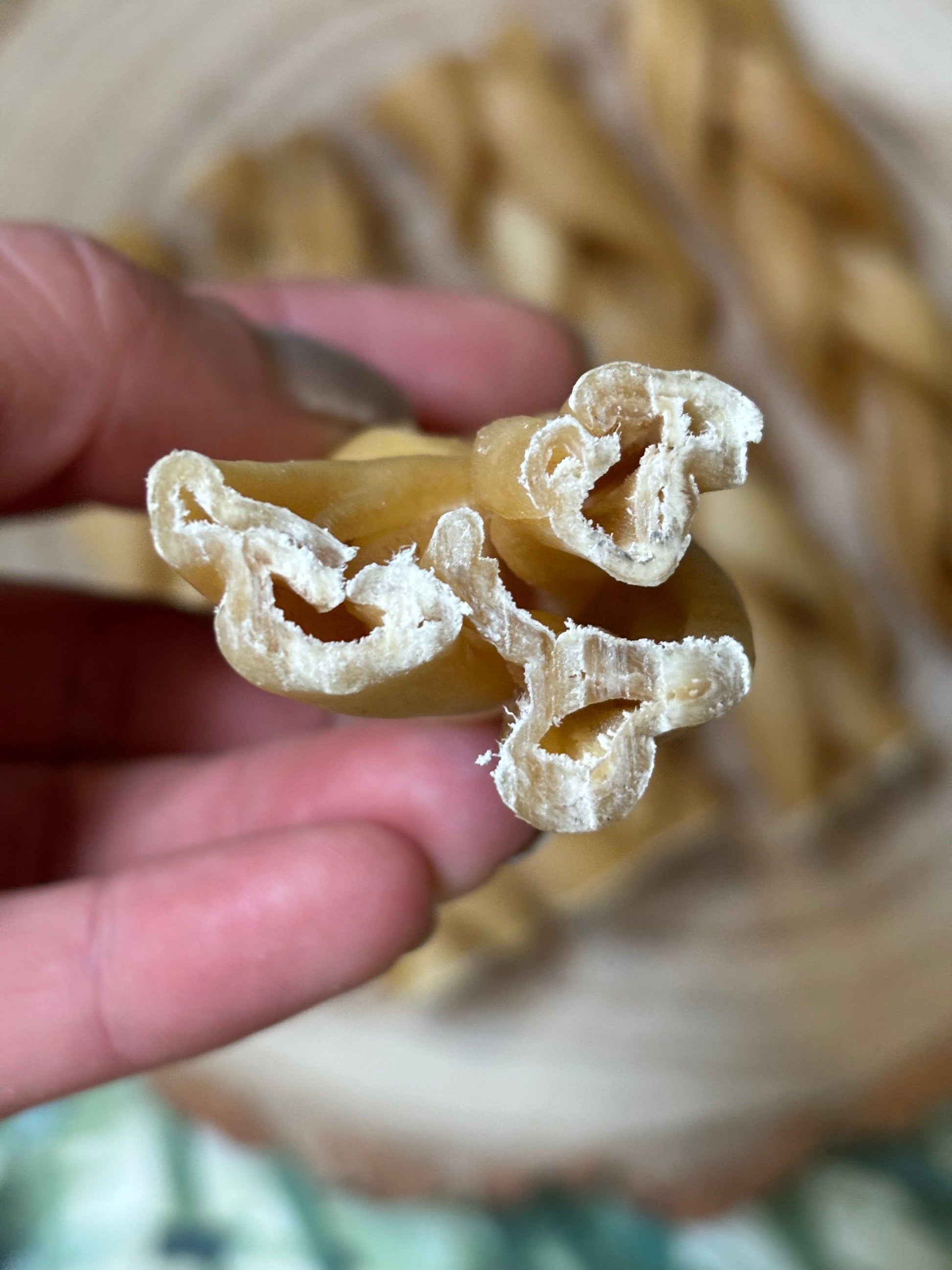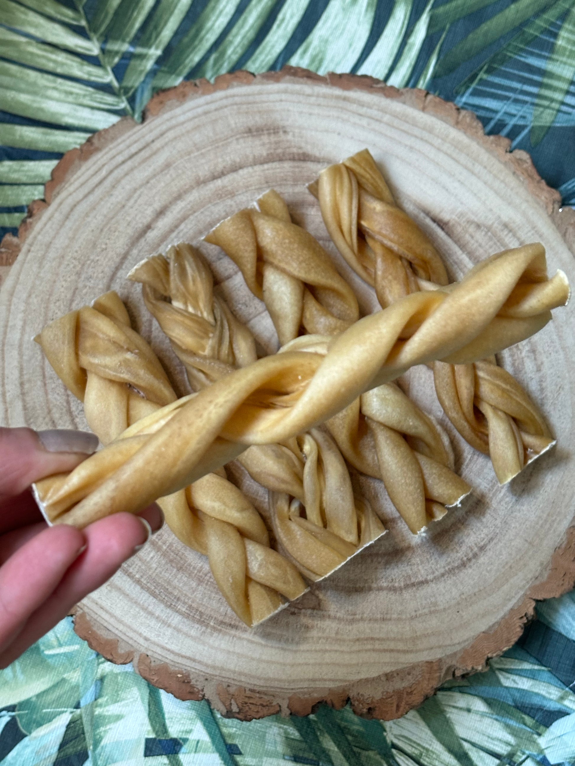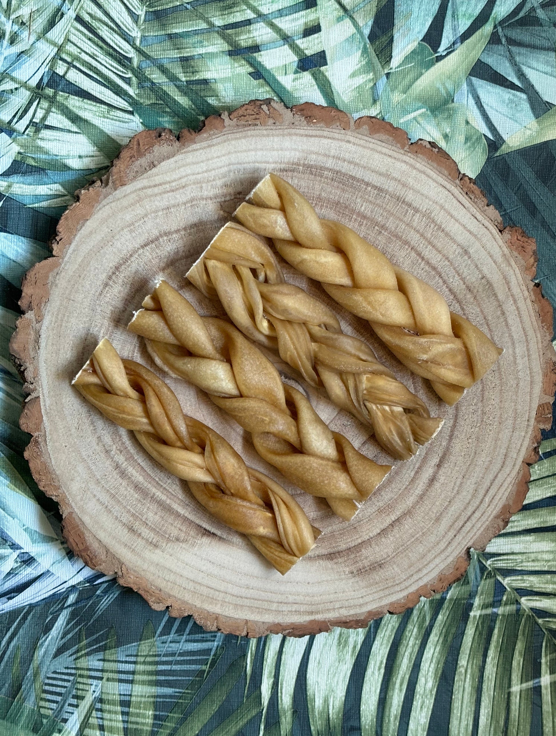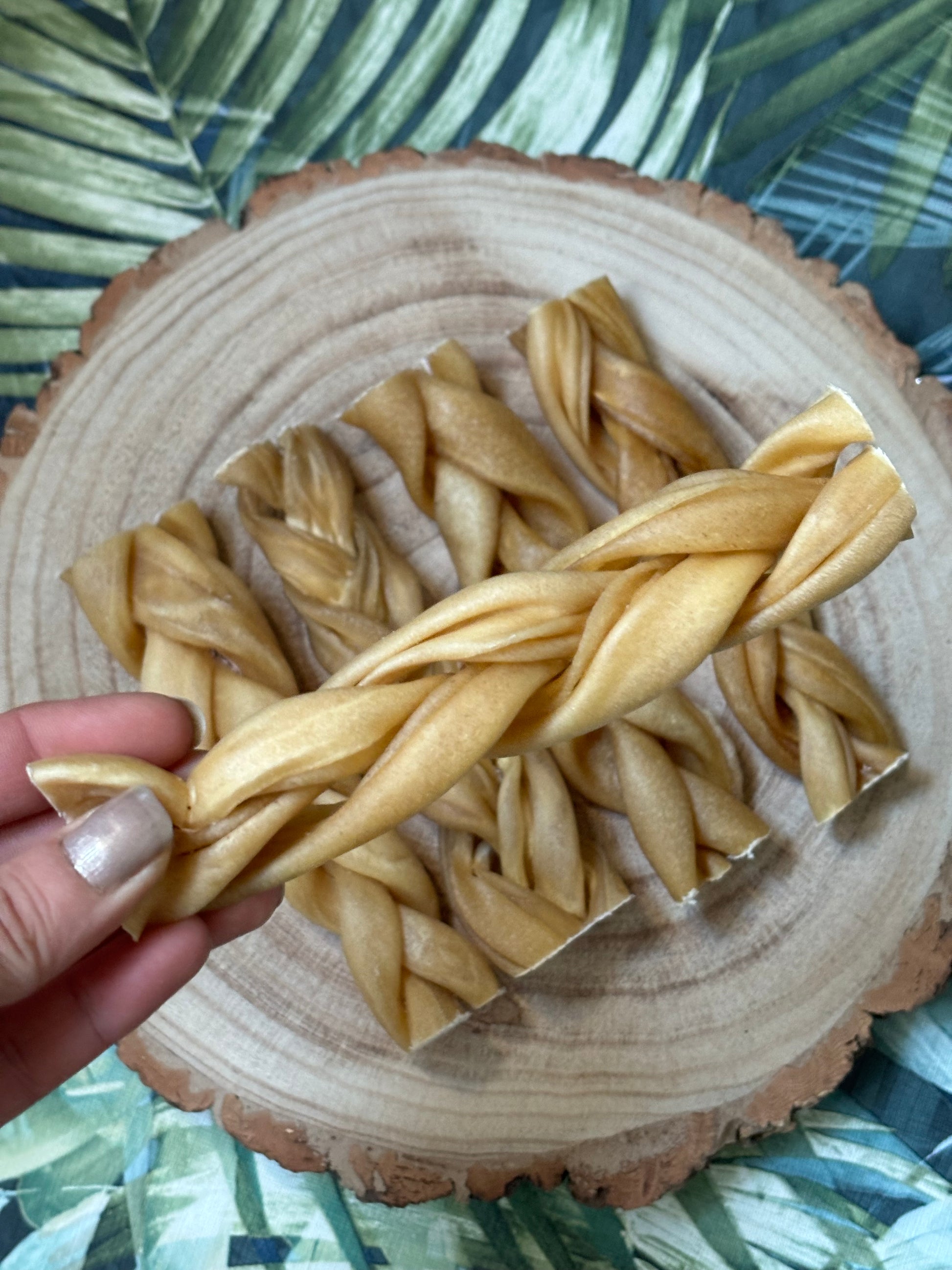 Our Braided Skins are made by braiding together strips of skin to create a durable and long-lasting chew. The braiding process not only adds to the treat's visual appeal but also provides an engaging chewing experience for dogs. Skins are often rich in collagen and protein, offering a satisfying and flavourful option for dogs who enjoy chewing. These treats can help promote dental health by encouraging dogs to gnaw, reducing plaque and tartar buildup.